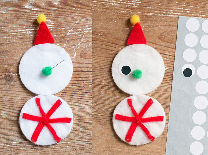 Stitch the 2nd pom-pom to the head of the snowman for a nose and make a knot at the backside of the pad for finishing stitches. Add small round stickers to bigger round stickers and place them on the snowman’s head for the eyes. You could also use buttons or googly eyes!