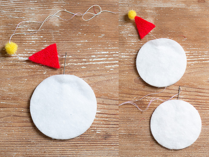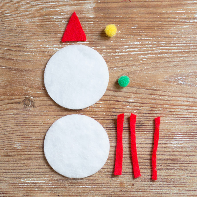 Set out two cotton pads and two pompoms. From your felt, cut out a triangle for the snowman’s hat and three, thin felt strips measuring the same diameter as the cotton pad.