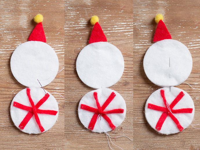 Place the felt strips on the body of the snowman, forming a star. Stitch to the pad.