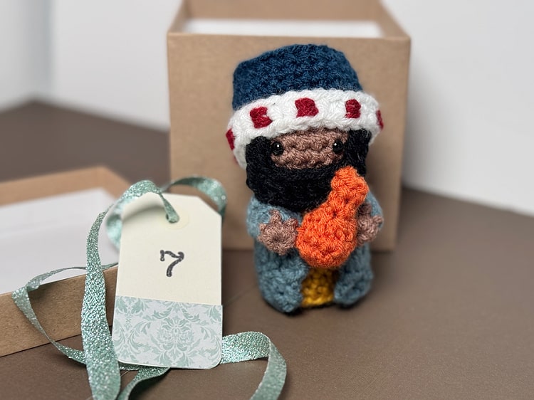 • Worsted weight yarn in 8 colors- skin tone, hair color, 5 colors for clothing, and one for the gift (Sample made with Loops & Threads Impeccable in Gold, Misty Blue, Claret, and Sapphire, Loops & Threads Soft Classic in Coffee, and Red Heart Super Saver in Soft White, Black, and Carrot)