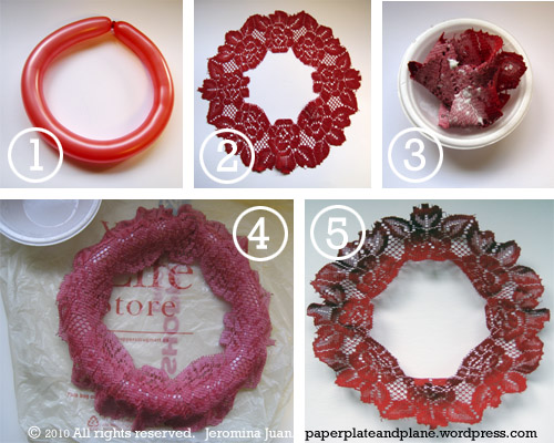 A large 14″ red lace doily, a long balloon or a 10″ Styrofoam wreath (I was resourceful and used a balloon as I had plenty left over from my Halloween balloon body parts project), a small disposable bowl, white glue, and black satin ribbon.