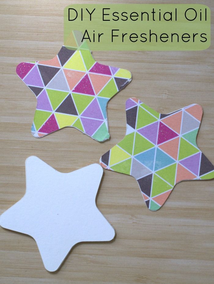If you’ll be hanging this DIY essential oil air freshener, you’ll want to punch holes in your shapes before assembling them. During assembly, line these holes up. Thread a length of ribbon through and tie a knot. Now you can hang these in your closet, car, or anywhere that needs some freshening up.