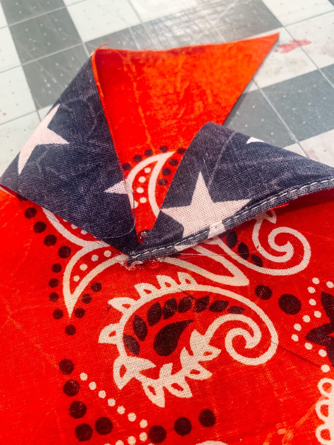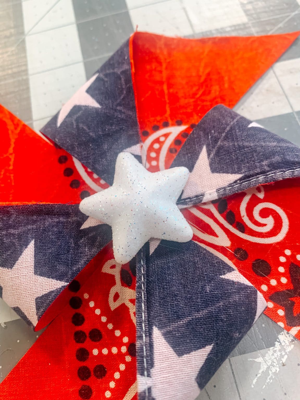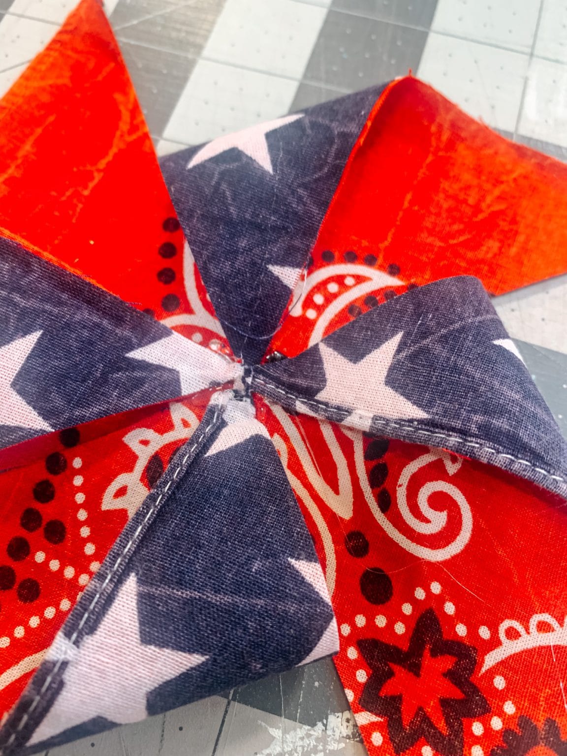 1 – Grab 2 different patriotic fabrics of your choice. I am working with my blue bandana and my flag bandana as well. Iron your fabrics to remove all those wrinkles.