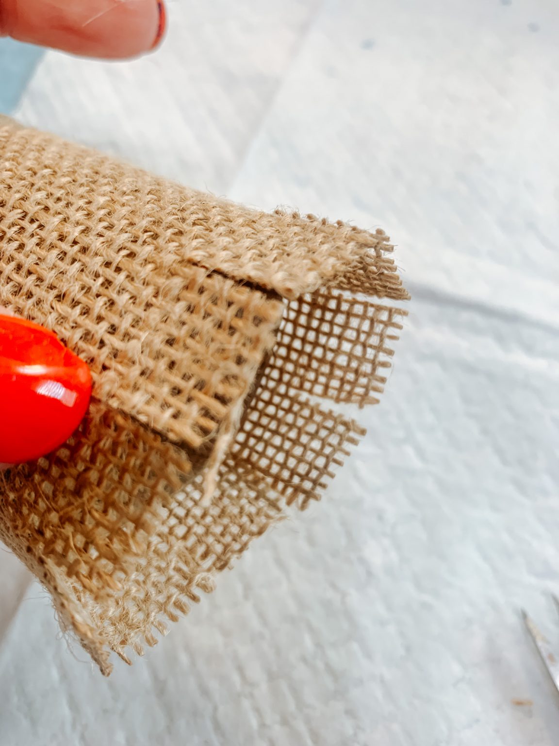 6 – With the excess on the lip of the burlap, you can simply cut a few snips into it to help you fold it inside your roll. With your low temp hot glue gun, add a bit to secure and clean it up. Repeat for as many napkin rings as you plan to make for your tablescape. Tip* If you have a regular temp hot glue gun, use your finger coverings so you don’t get burned. Set aside. Tip* You can add a strip of excess fabric around your burlap-covered ring to add a little bit of extra cuteness to it.