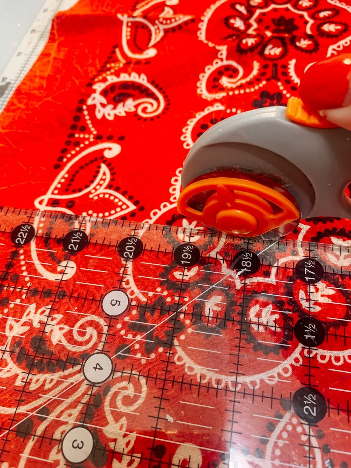 2 – Lay your bandana out flat and cut it in half with your rotary cutter so it is easier to work with. I wanted my napkin rings to be big and bold, so I cut my pieces of fabric to be 6×6”. If you want them to not be as big, just adjust your measurements a bit. Repeat so you have both of your pieces of fabric cut into 6×6” pieces.