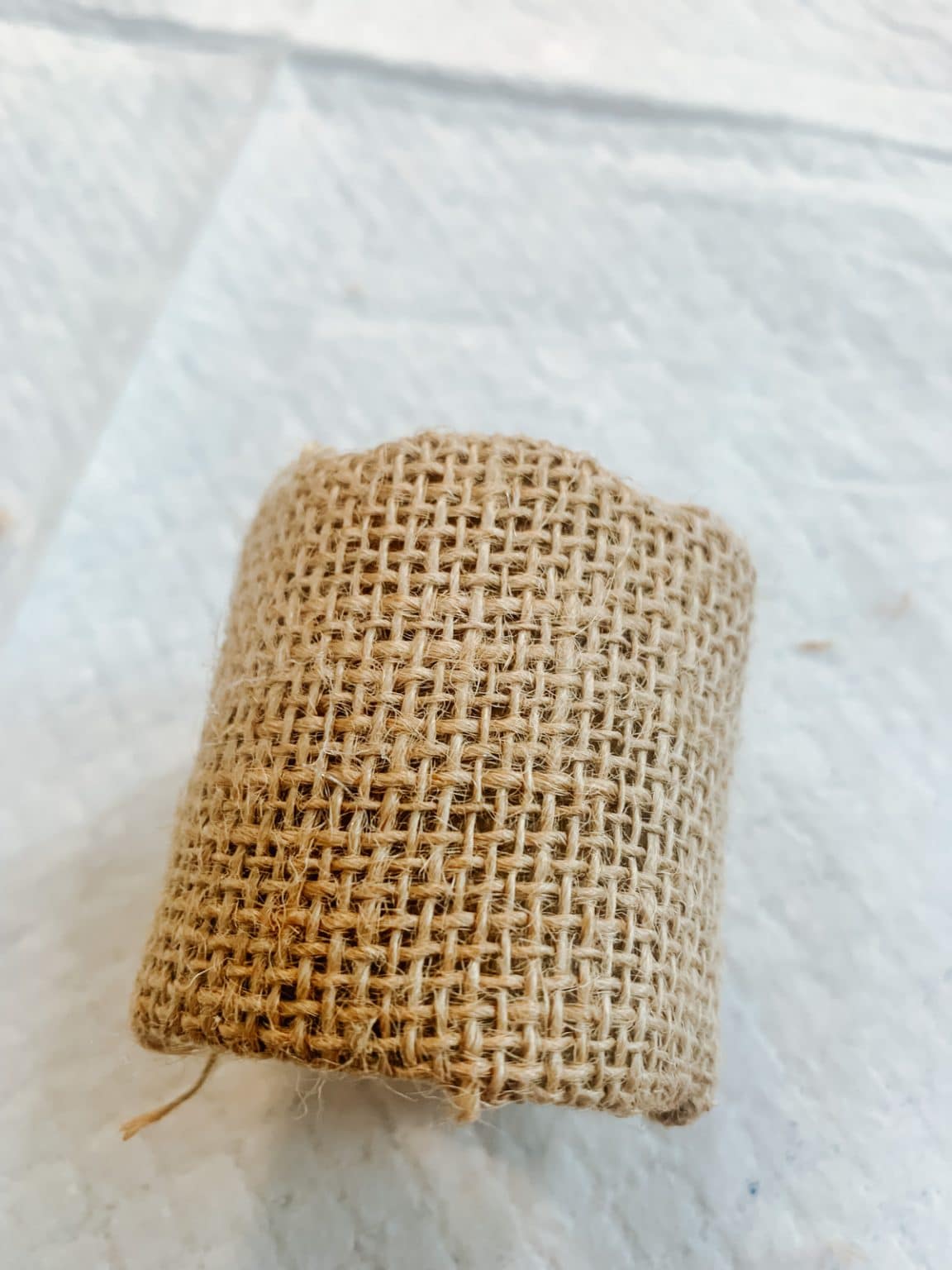 5 – To reinforce this ring, grab your burlap and measure out the amount you will need to cover your roll, being sure to leave yourself a lip on both sides. Also, have enough to overlap a bit to have it completely covered. Use your Spray Adhesive and spray to the back of your burlap. Then place your napkin ring on there and it will adhere easiest. Hot glue also works too! Tip* You can also use jute and wrap around the ring, hot gluing as you go.