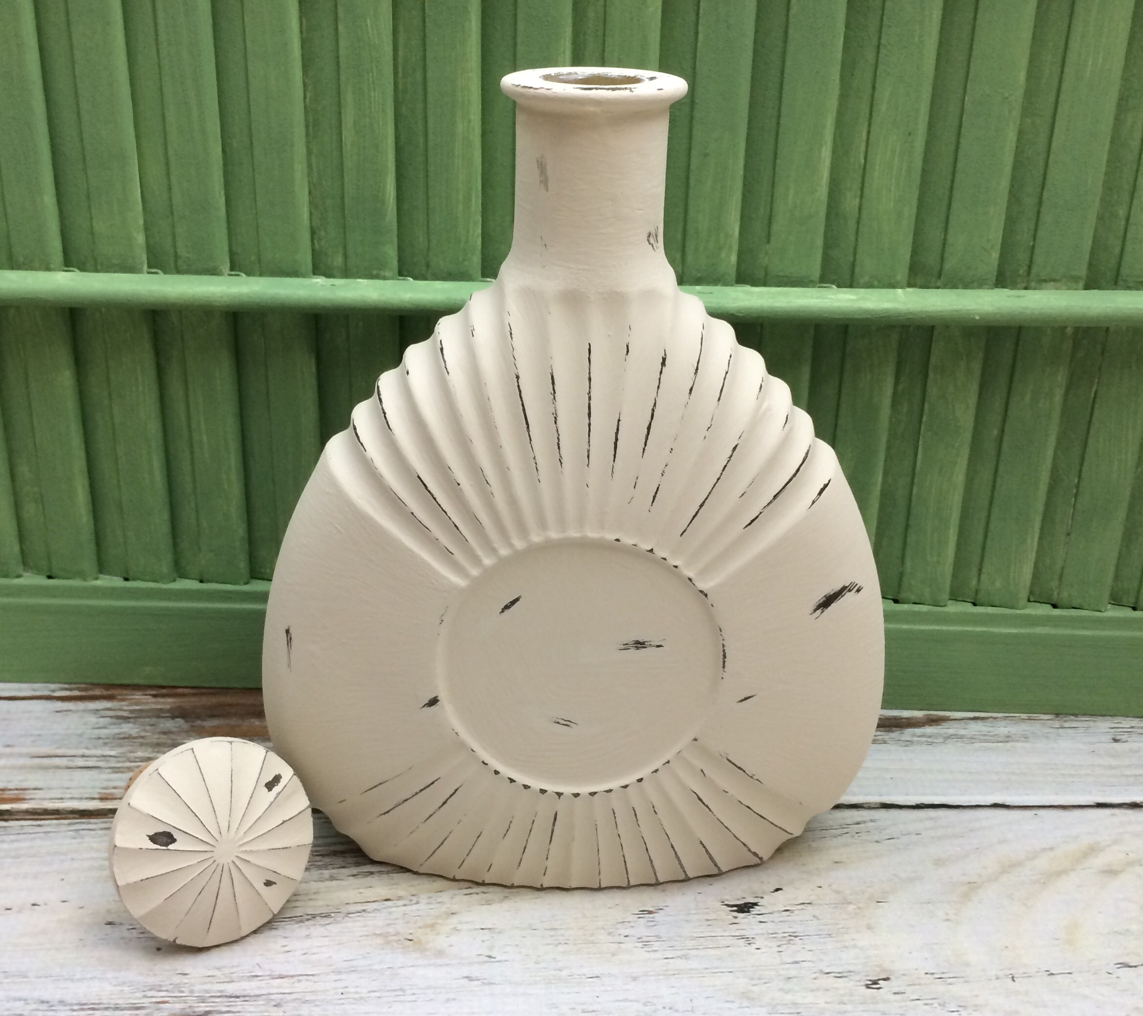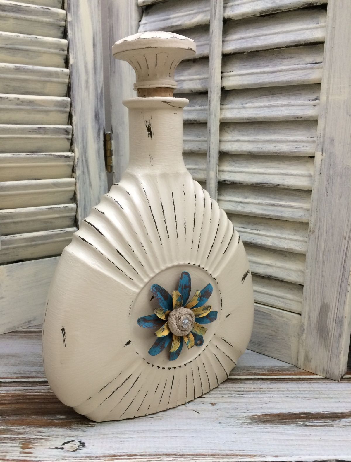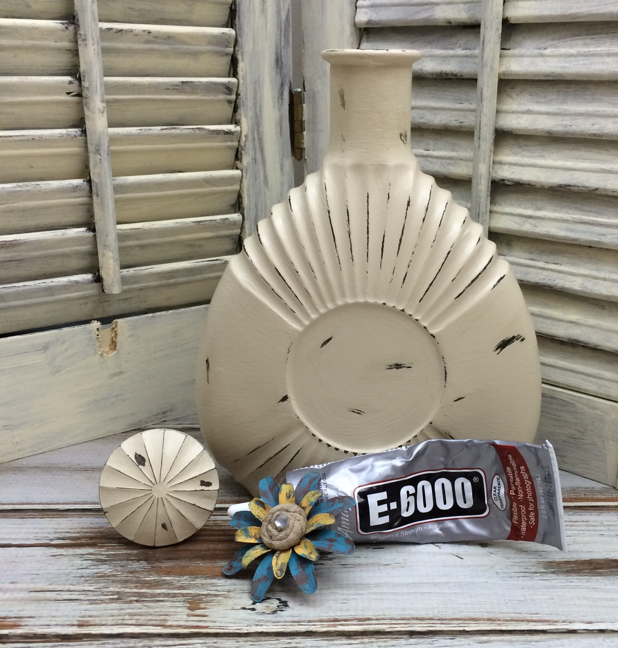 And this was just the perfect bottle. So I laid the bottle down flat and used my E-6000 glue to attach the metal flower to my diy decorative chalk paint bottle. I let dry over night.
