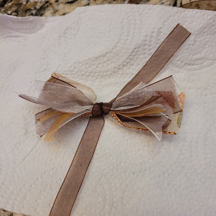Attach the bow to the decoupaged pumpkin stem with just or another piece of ribbon.
