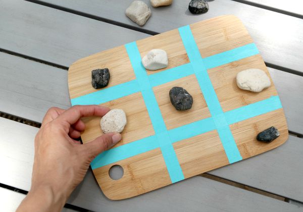Next, measure and tape off the last 2 lines, then paint and let them dry completely before ripping off the tape and playing a few games of tic tac toe! In the pic below, I used black and white rocks from outside to play. Also consider jazzing up your game pieces if you’d like!